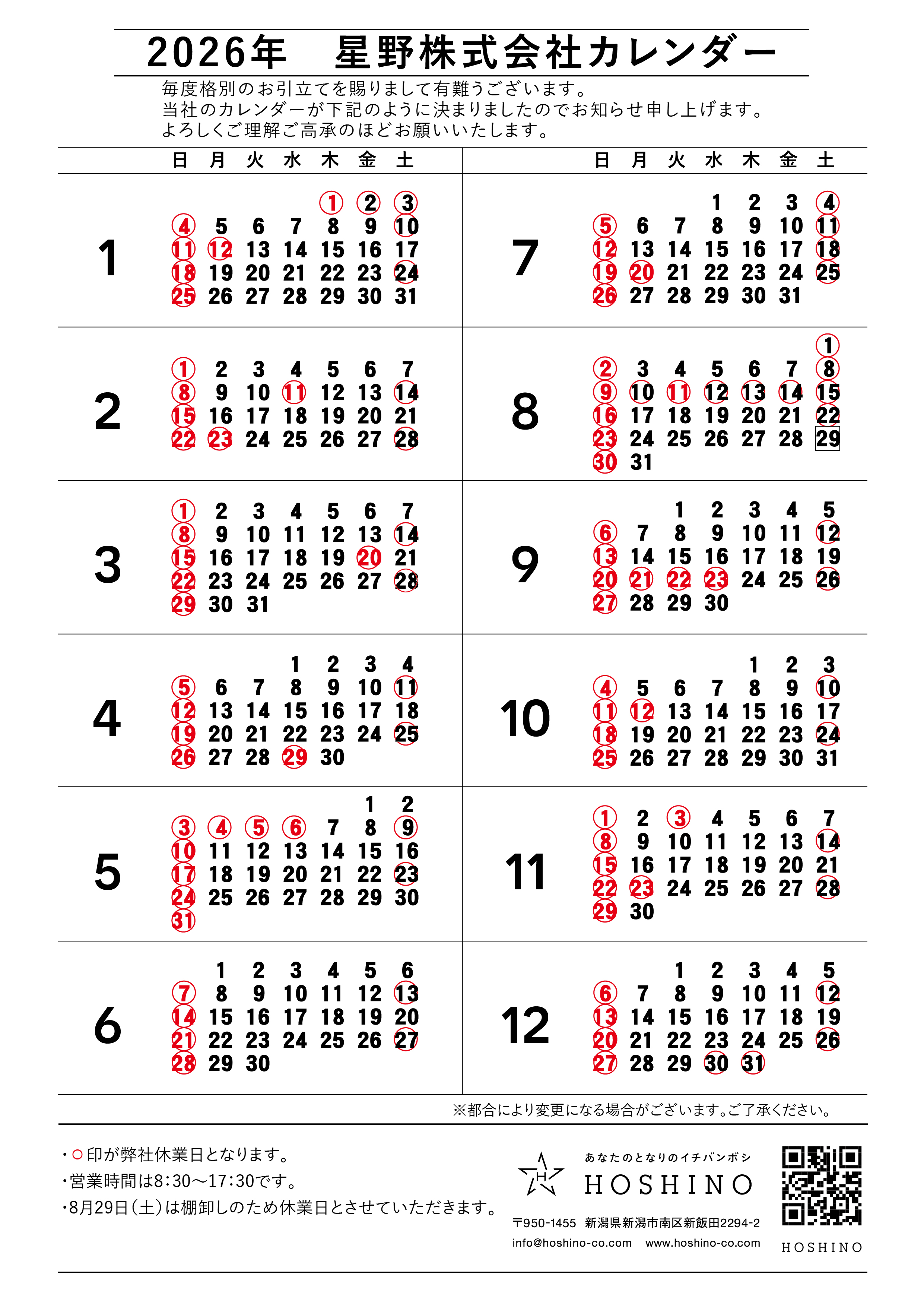 2026年の営業予定をお送り致します。