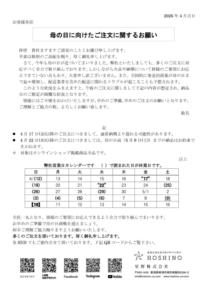 また、全国的に発送出荷量が母の日まで益々増加し、配送業者を含めた配送に関わるトラブルが起こることも予想されます。
