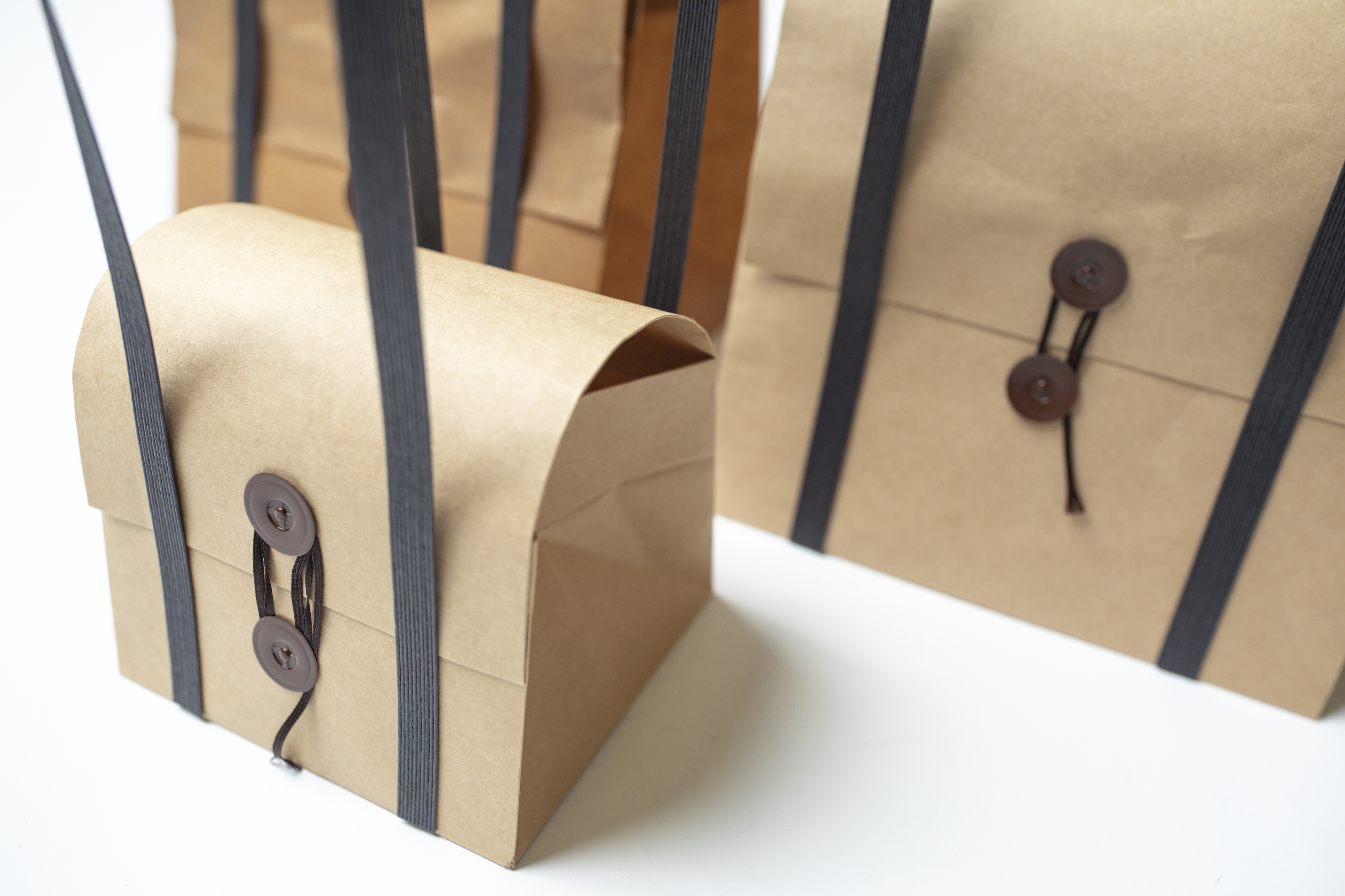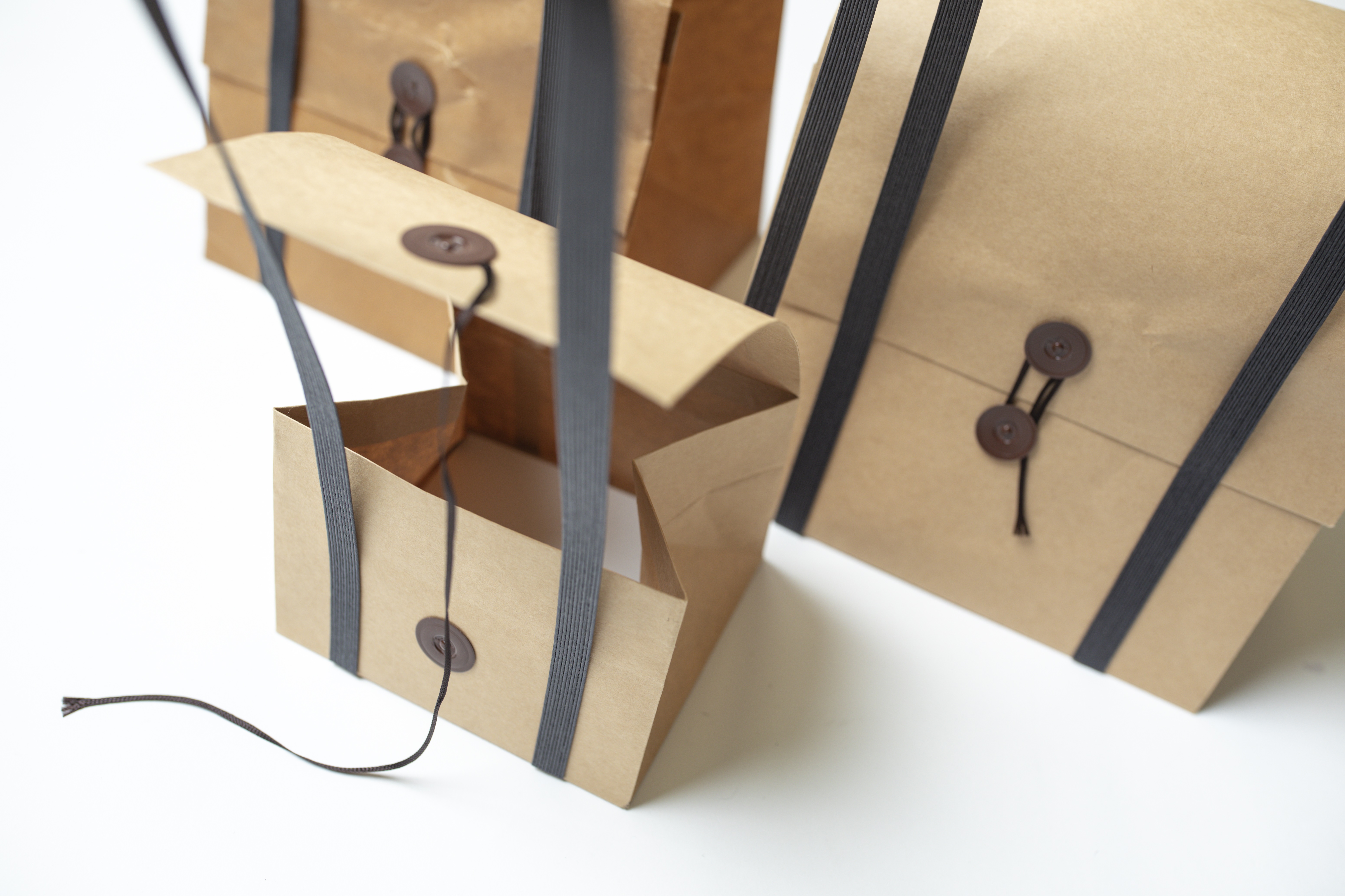 クラフト紙のナチュラルな質感をいかした「トートバッグ」と「ワックストートバッグ」。封筒のような紐どめがアクセントになっている、宝箱のような形のオリジナルバッグです。