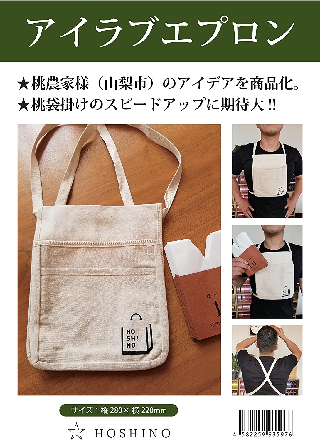 山梨市の桃農家様のアイデアを商品化した、もも袋掛け用前掛けです。ポケットから袋を取り出しやすく、作業が大幅に楽になります。