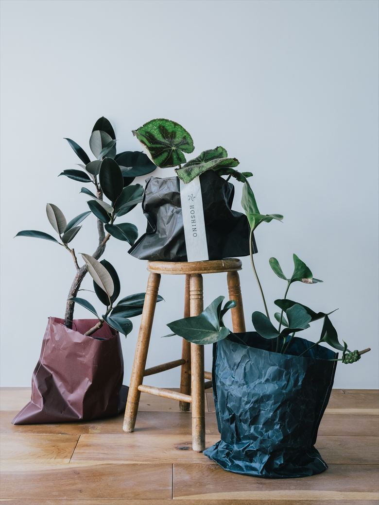 「JIU」と「ROCA」をバッグに仕立てました。その特徴のひとつは、ワックス加工を施しているので自立できるということでしょうか。また、鉢カバーとしてはもちろん、アイデア次第で暮らしの様々な場面でお使いいただくことができます。
